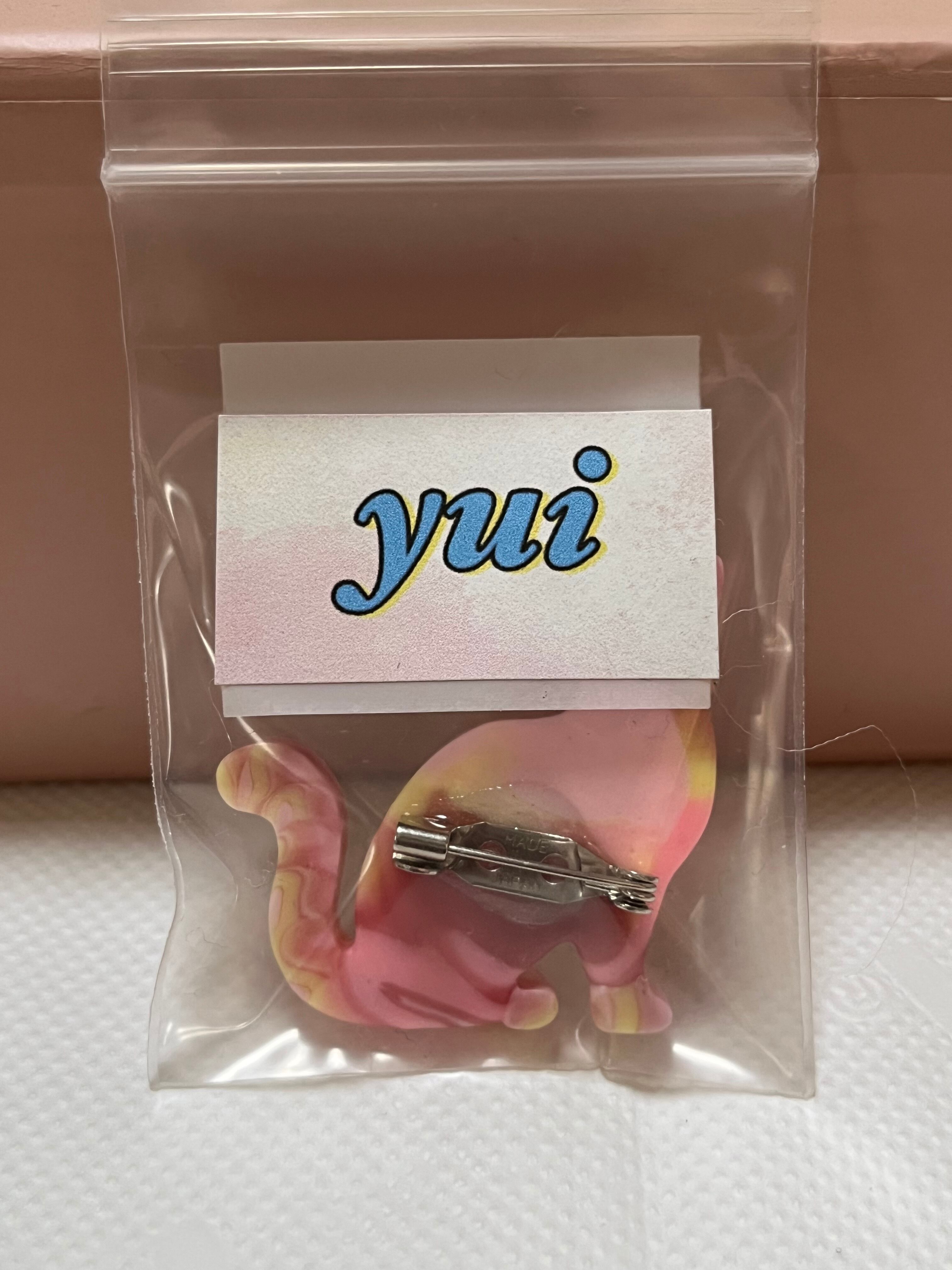 ピンクや黄色を用いてマーブル模様になった猫のブローチ