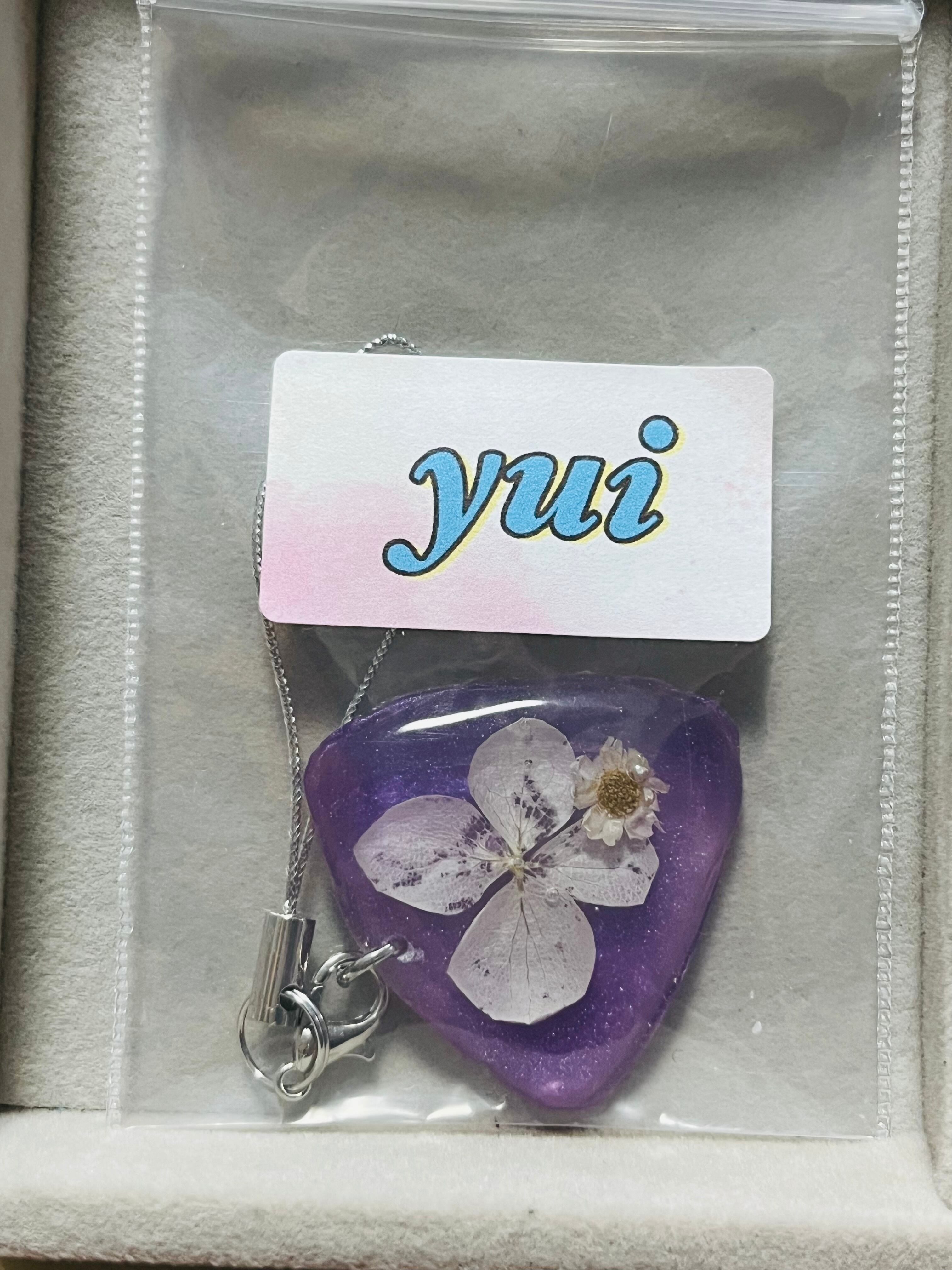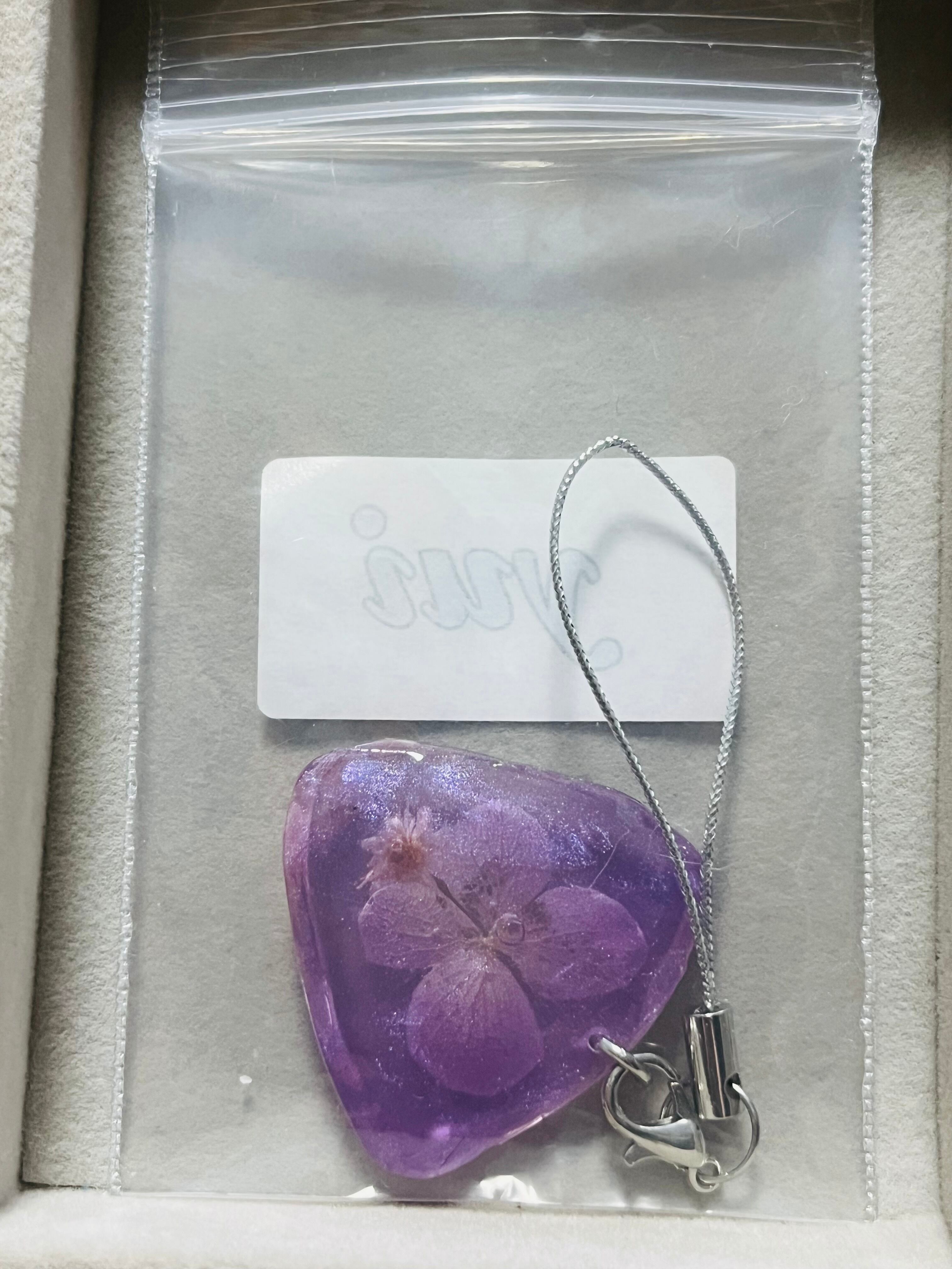 紫色の中に花を埋め込んだピック型のストラップとなります。