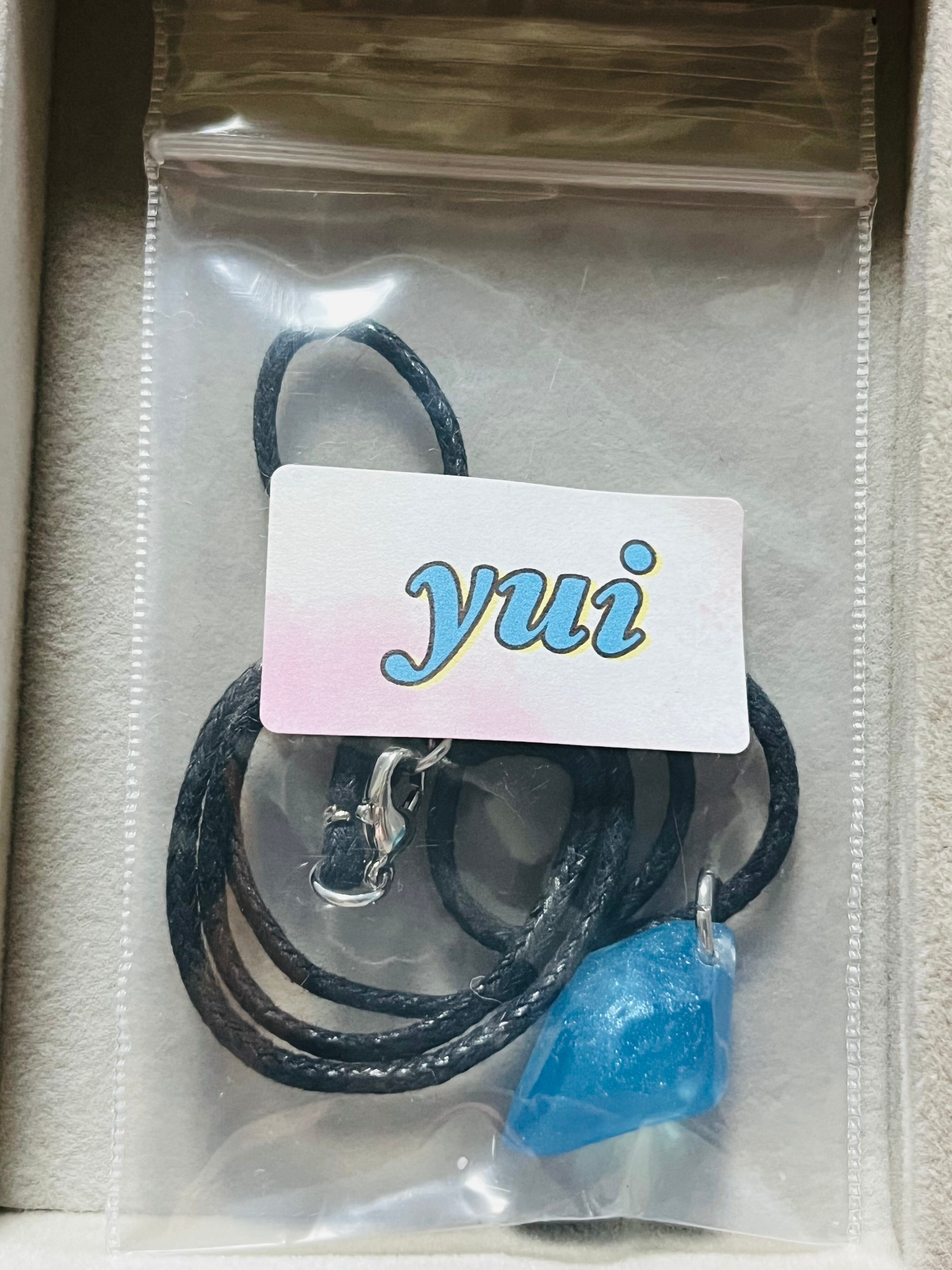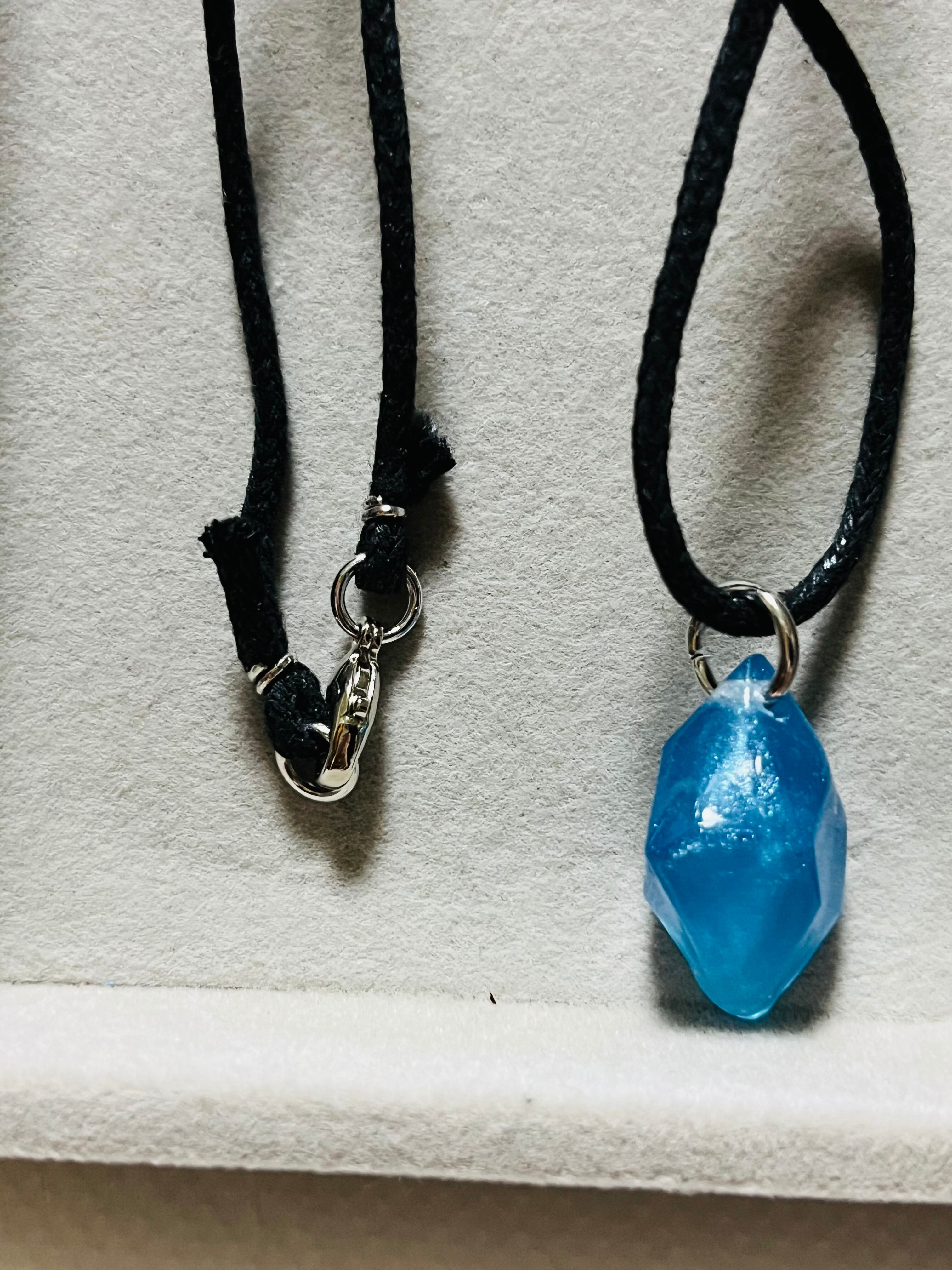 透明感ばっちりな青色の宝石型ネックレスとなります。