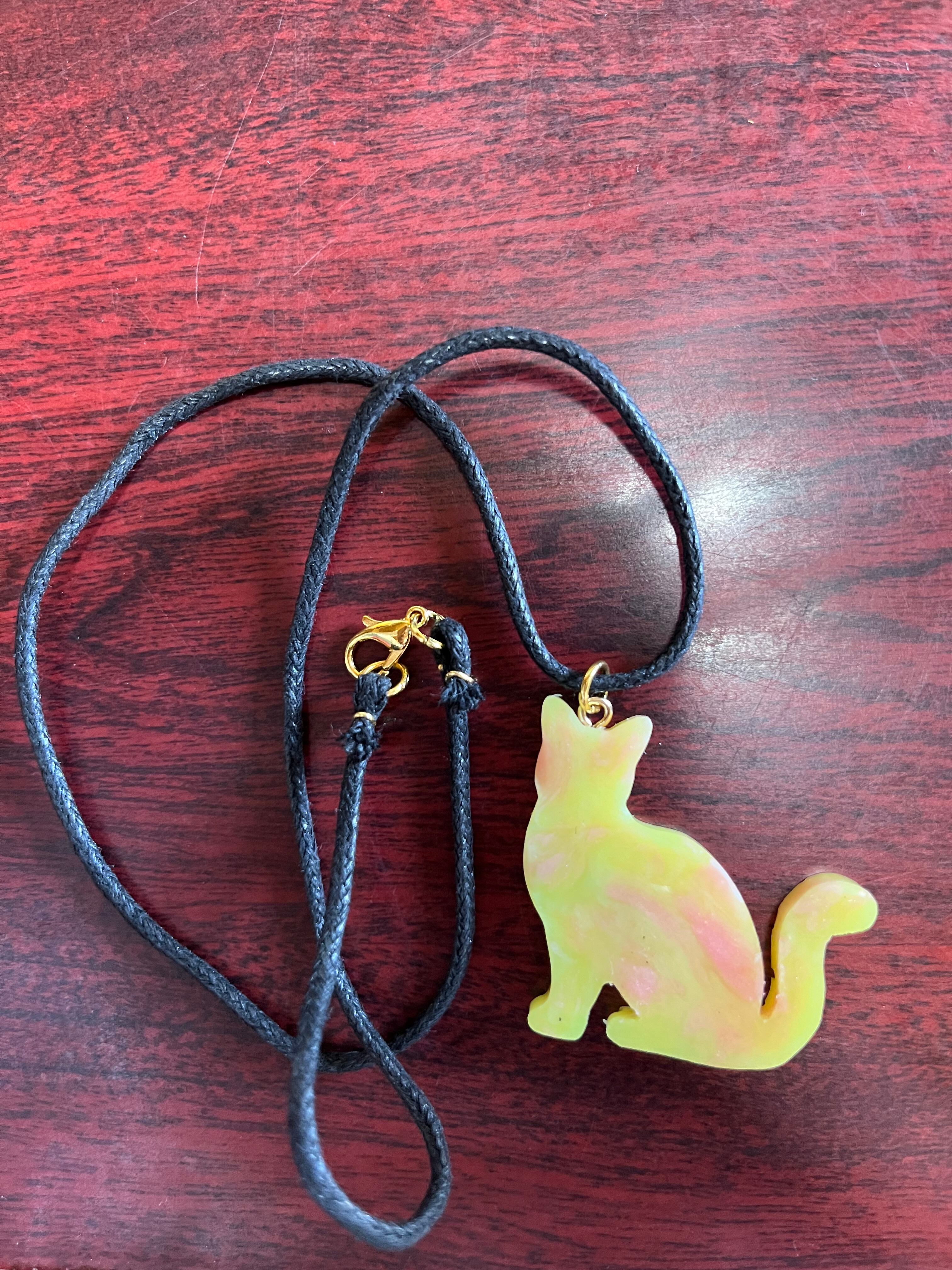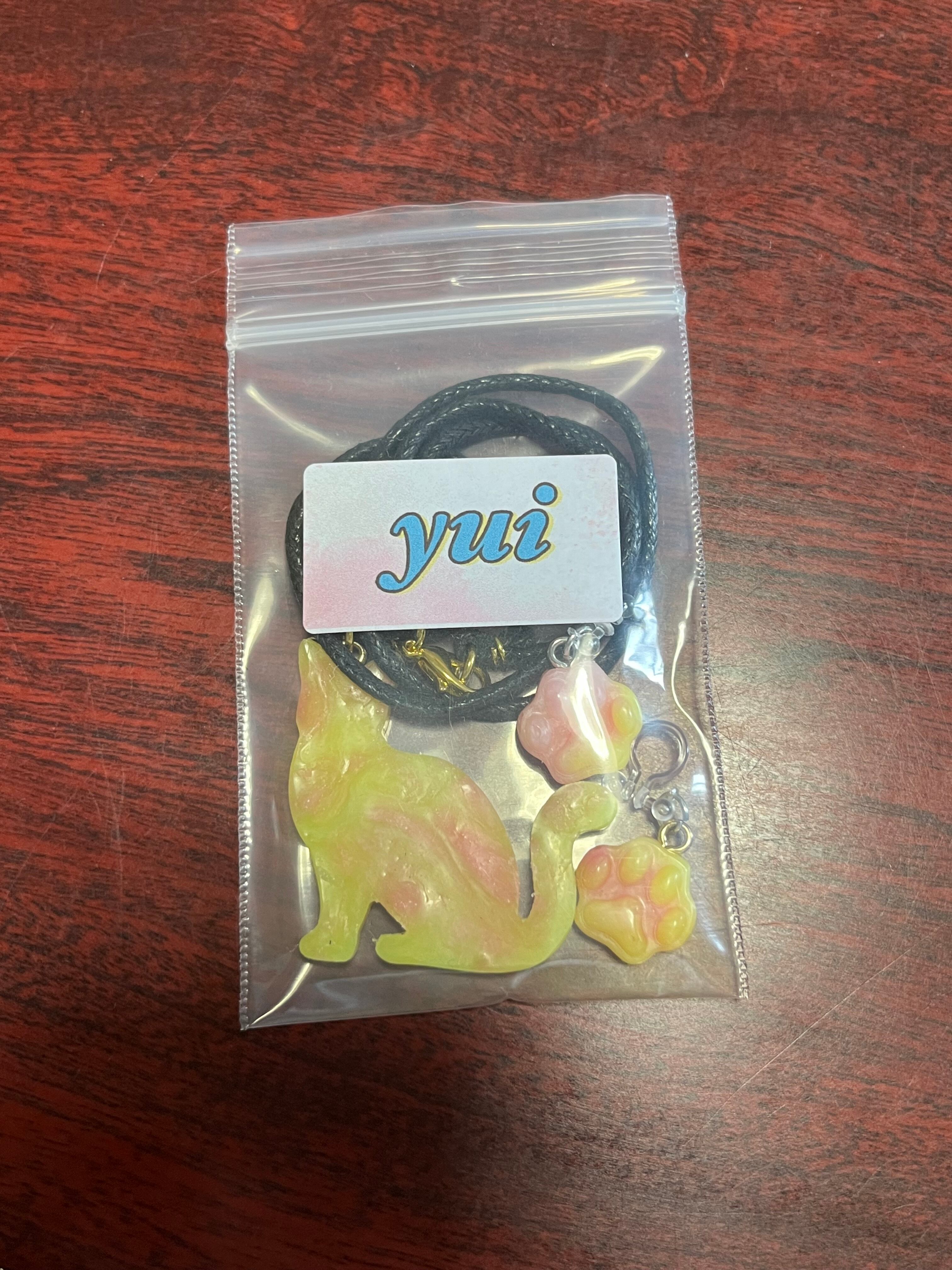 黄色とピンク色を使いネックレスとイヤリングのセットとなります。