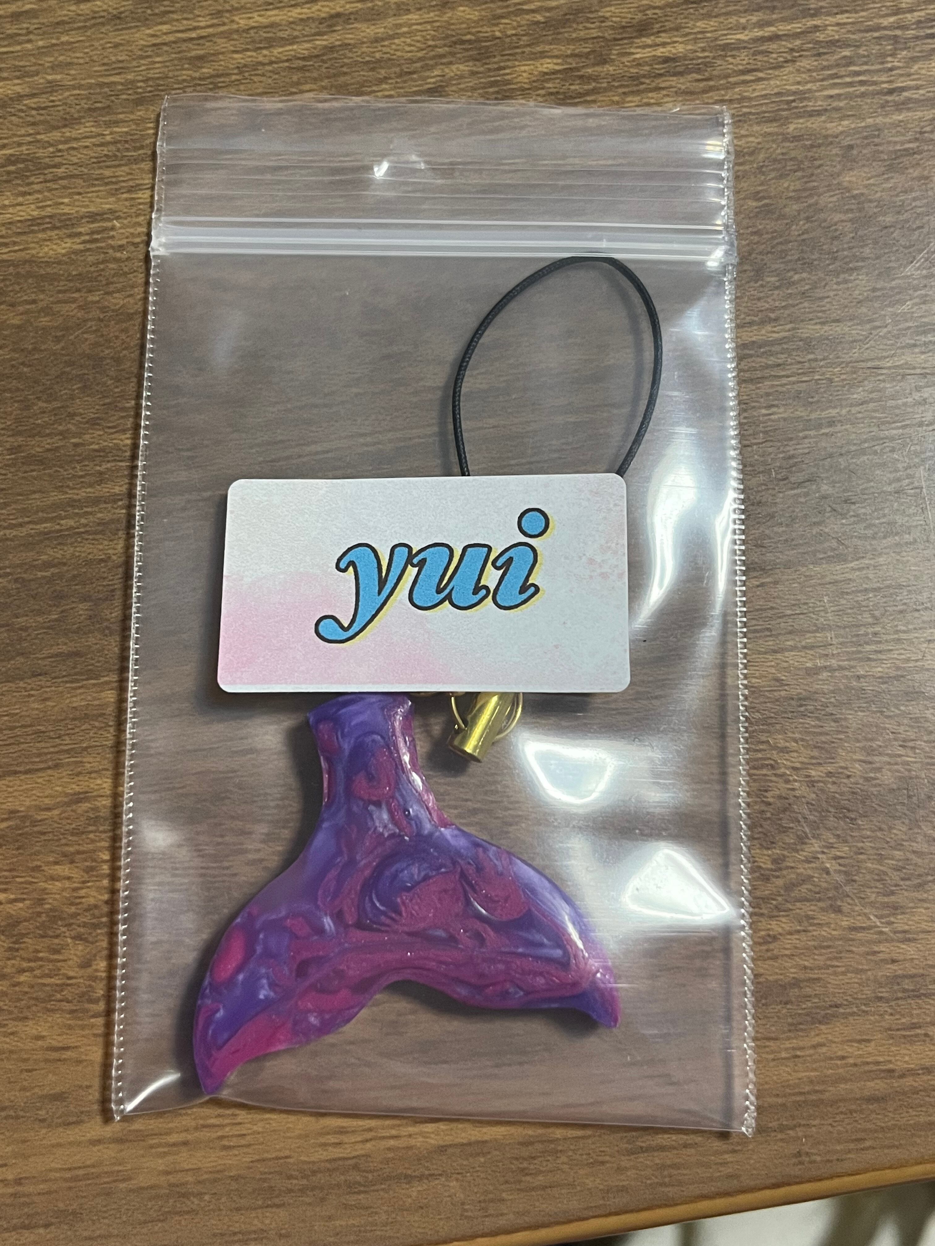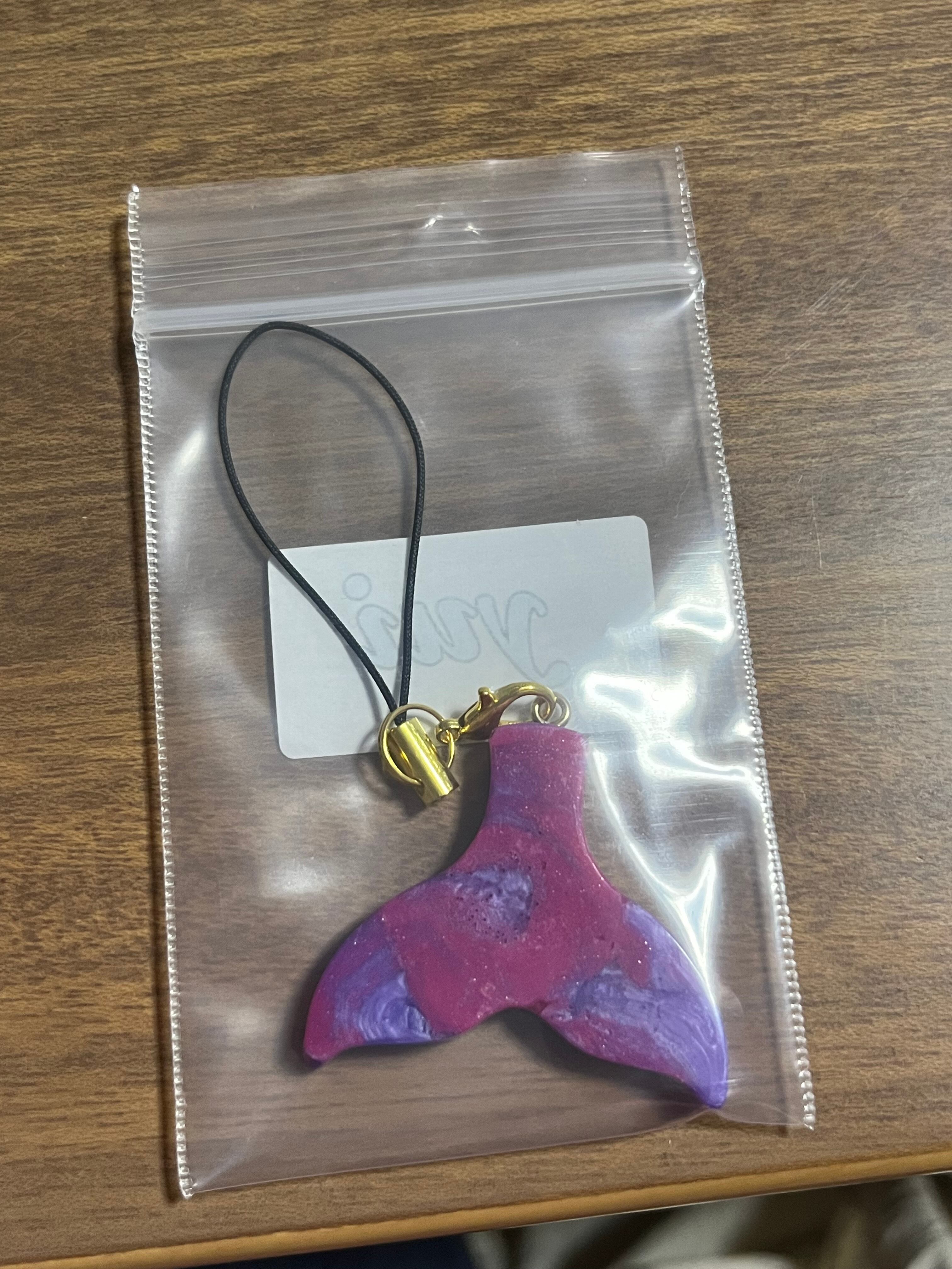 赤と紫を混ぜたクジラのしっぽ型ストラップとなります。